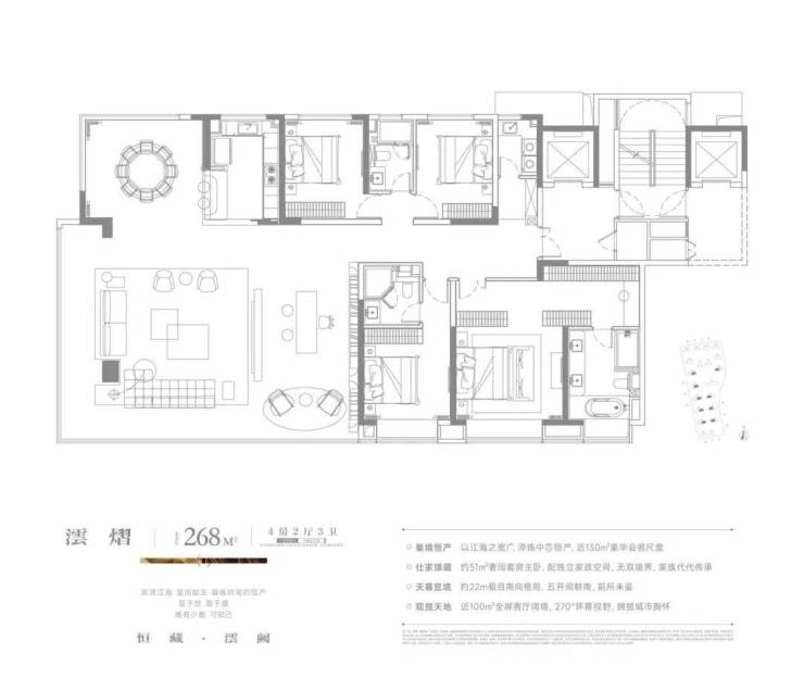 采用两梯一户,270°转角环幕客厅,自带家政保姆间,5个房间、5个卫生间...