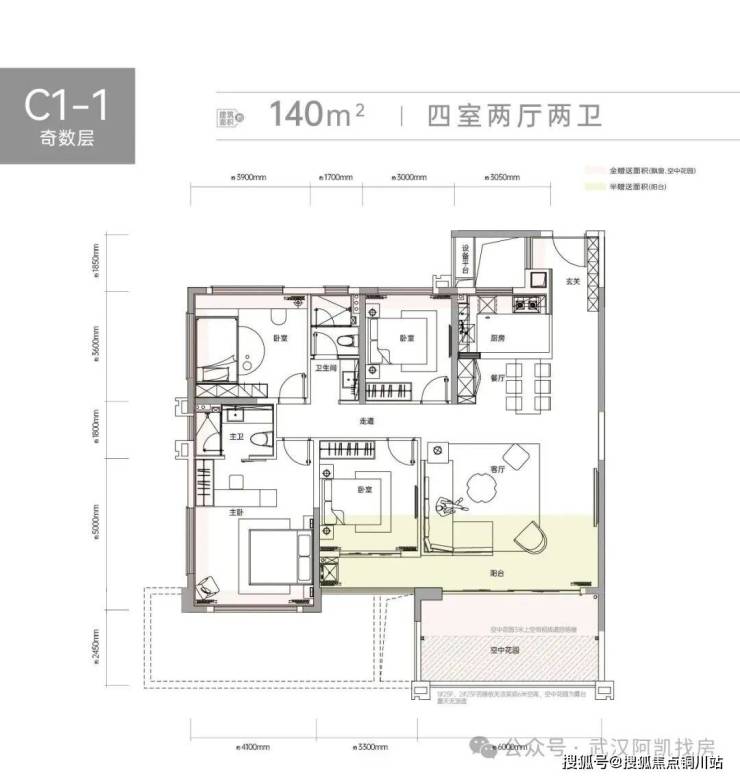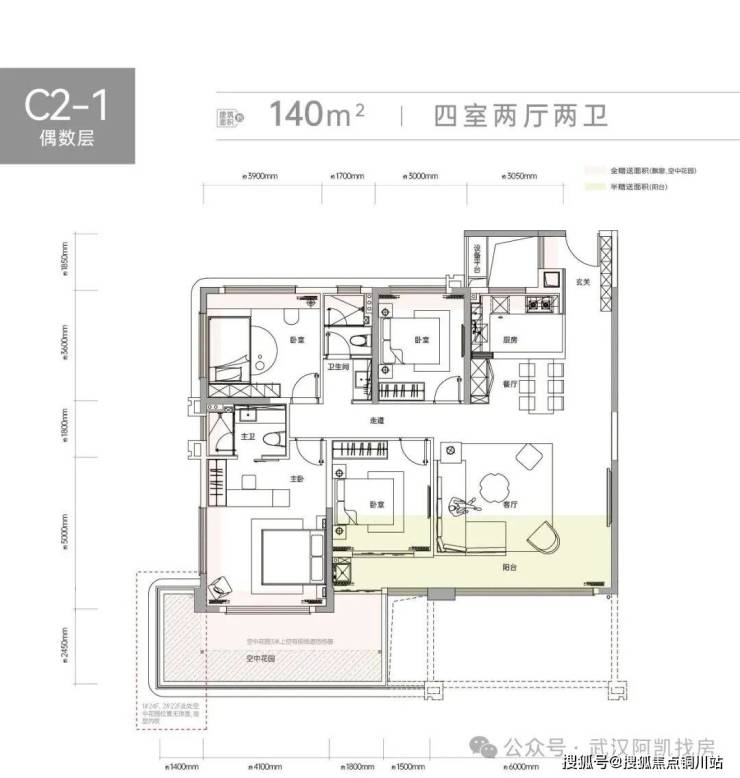 C2揽境在售建筑面积约107-140㎡三室、四室户型。