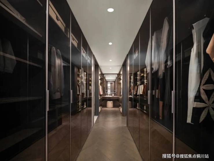 约6米超高空间的车库入口,搭配爱马仕黑廊柱、鎏金金属格栅、星空顶廊道,彰显豪宅气场;车马厅顶面采用铝板铺装,两侧奢石岩板,水磨石地面镶嵌全区域铜制归家标识,一眼震撼。