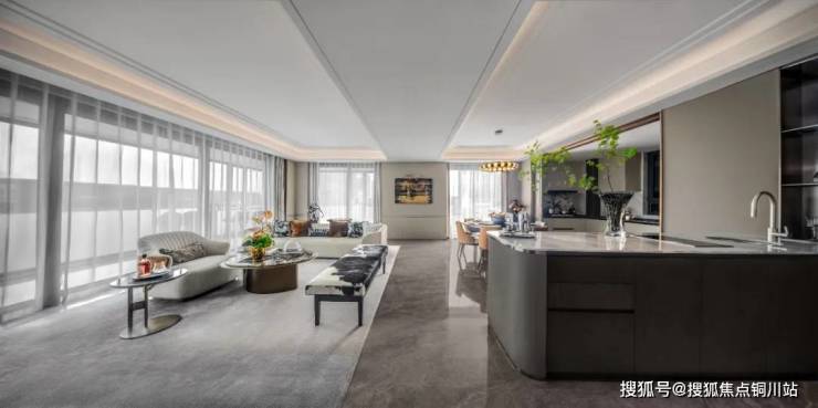 270°环幕采光:进入室内,约7.2⽶IMAX横厅,连通270°L型跑道式大阳台,园林美景被揽入室内,坐在客厅内即可欣赏青山明月、云卷云舒,居者的豪迈人生不言自表。