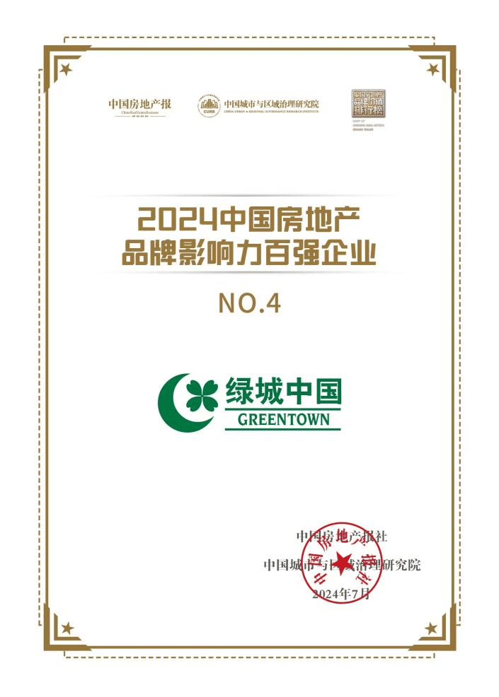 今年7月份的第十四届中国房地产品牌发展大会上,绿城中国收获了“2024中国房地产品牌影响力百强企业TOP4”,“2024中国房地产品牌创新引领力企业”“2024中国房地产品质品牌标杆企业”等荣誉。