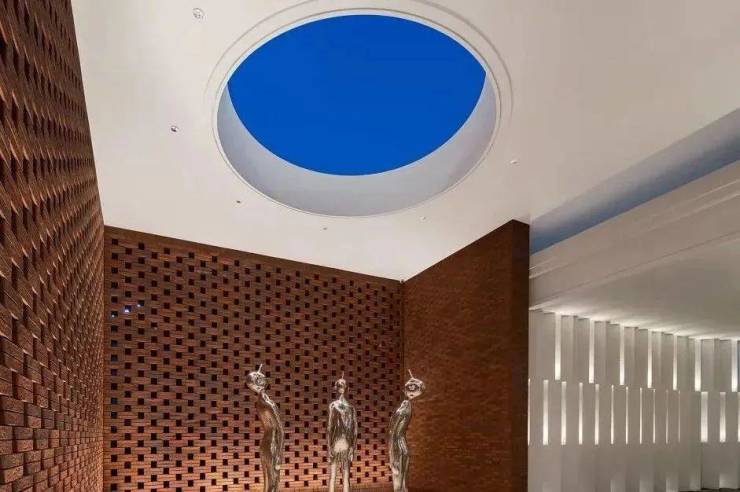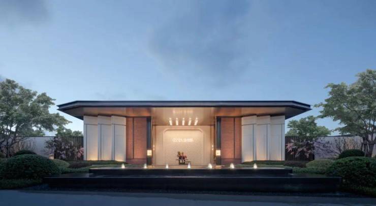 门楼用东西方杂糅的美学语言,传承闽南建筑艺术。采用对称式构图,中间为超尺度酒店式落客等候空间,营造高端度假沉浸式归家体验,门头的细节也进行了精细化设计,屋面取形于鼓浪屿经典建筑的檐口,转译为门头造型的折型屋面。八角形屋顶气势恢宏,由香槟金不锈钢密拼而成。整个屋顶遵从布局对称、恢弘大气、层次分明的整体序列。