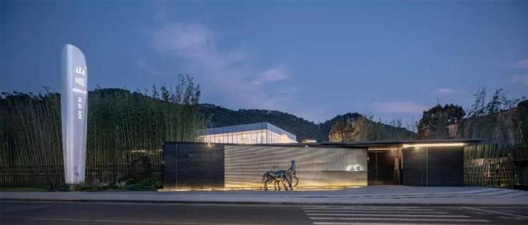 12800块琉璃砌筑成的影壁入口,配搭定制雕塑,形成具有横向延展昭示的空间界面。以薄水比拟江滩,雕塑为马,原由白居易路过此地有诗云“涂山来去熟,唯是马蹄知”。