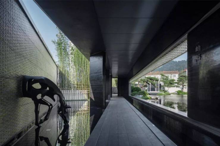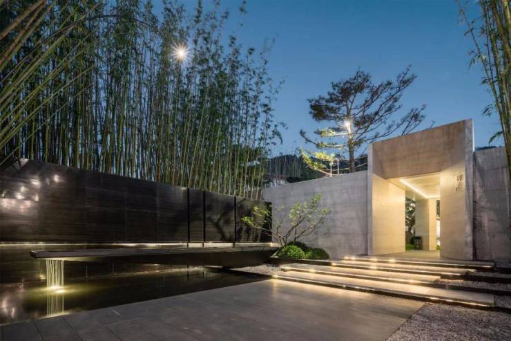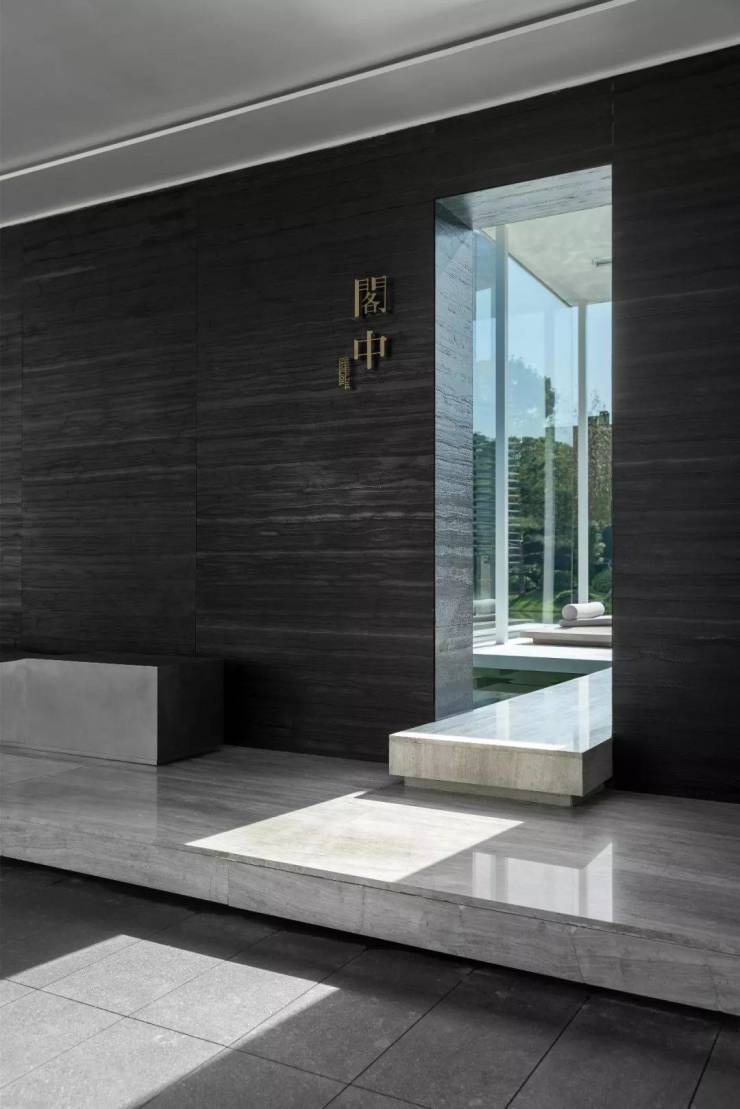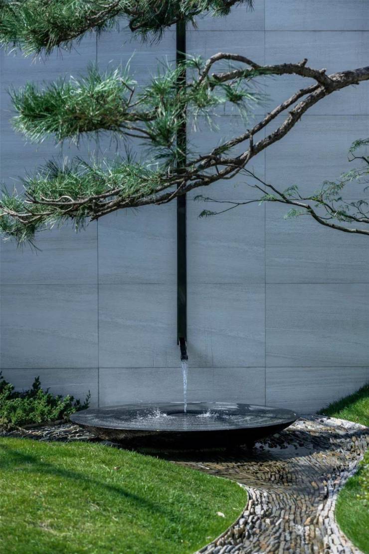 ”明月松间照,清泉石上流”。特选的38棵全冠移植古松,高低错落,营造隐逸而宁静基调。景墙围合的空间,让视线内向,为下一刻建筑入口前的空间开敞做欲扬先抑的铺陈。泉水蜿蜒,从墙壁的缝隙中流入大水院中,遂为“松间石泉绕青壁”。