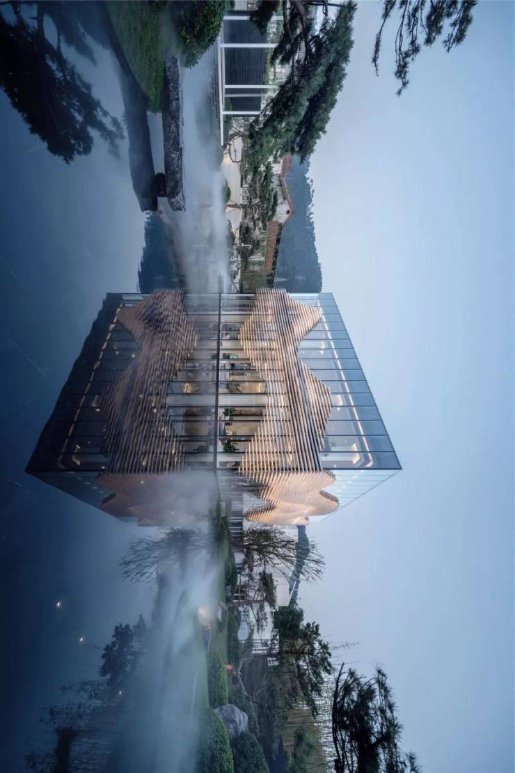 “阁中”的灵感取自南山的文峰阁,将传统的塔形构筑物倒立在水面,倒影中可见一个正立的亭,从逆转的空间画面中引发关于现实与虚幻之间的哲思。亭内顶部的三棱镜,在特定的时间点,可以投射一道彩虹到亭内。水里的星星灯与亭内的彩虹,宛若夜晚与白昼的对话,是为“阁中霓虹入星辰”。