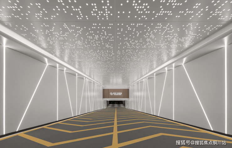 绿城黄浦湾地库入口及楼栋入户光厅均采用星空顶设计,地库入口墙面设计了灯光拉线,公共过道区域都采用了格栅吊顶和灯带,质感十足。