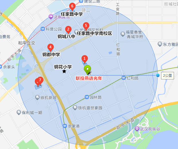 通过地图搜索,联投燕语光年附近约2公里范围,有多所中小学,除了武钢实验学校之外,不乏有钢花小学、钢城八中、任家路中学等青山第一梯队中小学。