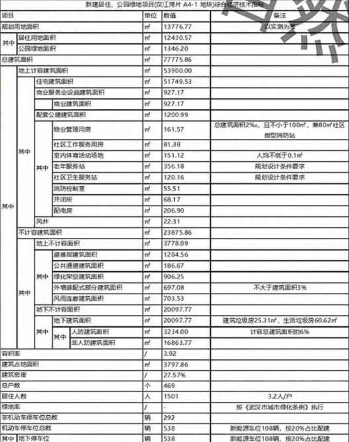 规划显示,该项目占地面积约1.4万方,总建筑面积约7.8万方,计容建筑面积约5.4万方,其中住宅约5.2万方,共包含约469套房源,共有机动车位约538个,车位配比约1:1.15。整体容积率约3.92,建筑密度约27.57%。