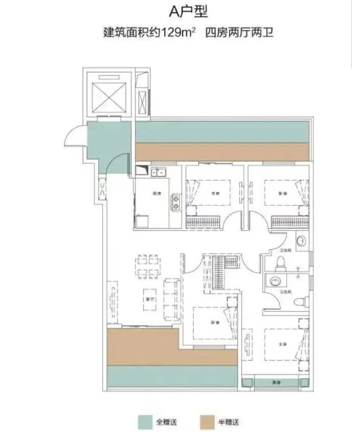 建面约129平四房两厅两卫,优化后实际得房率约98%。129平做四房,本已少见,南北向均有花池+阳台作为优化面积。