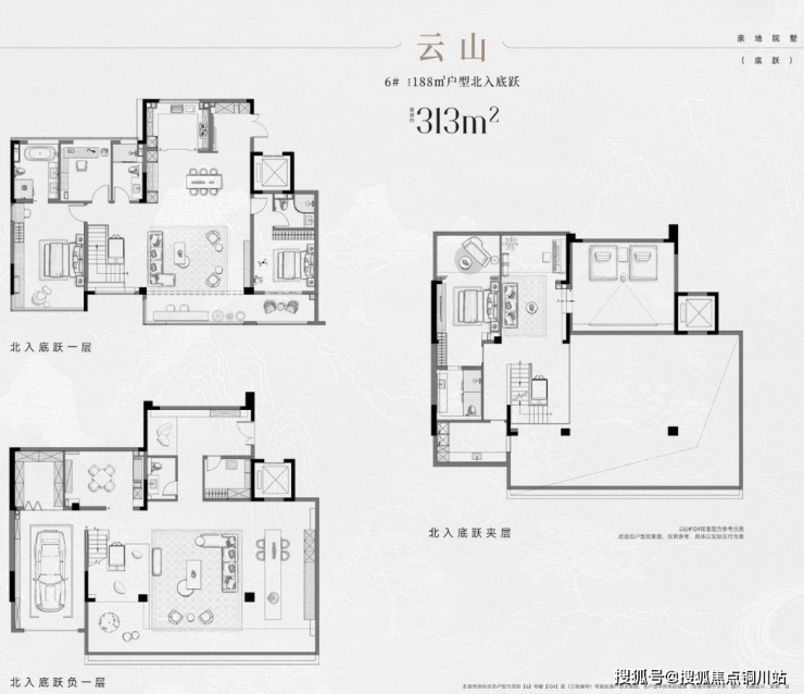 底跃—【私享院墅】户型建面约293㎡、313㎡、383㎡,南北采光最大约270°,地下室大面积光厅,因为地下室计入面积,拉低了单价,大概在4万小几。