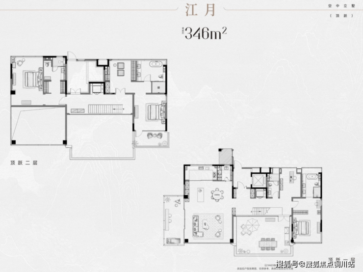 顶跃—【空中立墅】户型建面约262㎡、346㎡,可观山,南向采光无遮挡,带大露台,价格是全小区最贵的,要卖上5w+ ,预计1500-1600w一套;