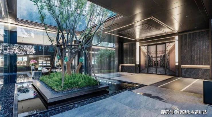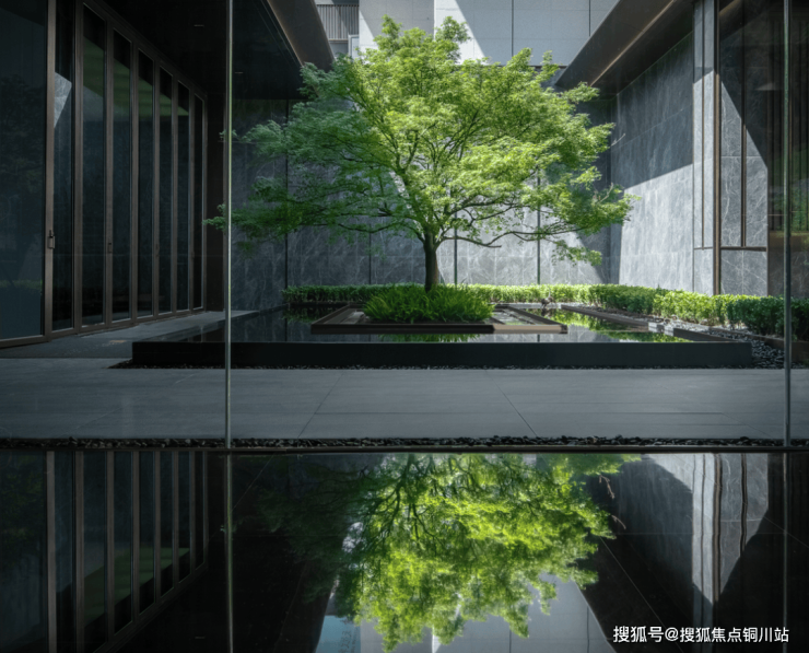 水庭中景为孤植的造型乔木,另一侧的奢石水台伸入水庭之中,结合精致雕塑和线性喷泉,使得场景更加生动。