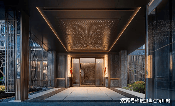 入口的艺术雕塑炼以江湖气质,将水的灵动与通透凝练其中,彰显其艺术品味与高定匠心。垂落的金属帘,营造出酒店式门厅的奢华感、尊贵感,作为障景,提供了相对私属的高端归家体验。