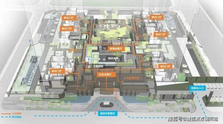 通过连廊、架空层、建筑挑檐等灰空间联动,串联主入口、各单元的入口、全龄活动空间、宅间花园,营造全龄社交剧场,形成多重院落空间,打造园区的活力动线;