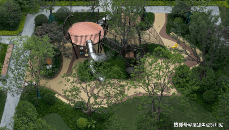儿童游乐场地以绿野仙踪为主题,采用大地色系的铺装材料,模拟真实树屋的游乐器械也为儿童提供了更加贴近自然的游乐体验。外圈环路串联的平台也为业主提供宅前休憩、亲子手作等活动可能。