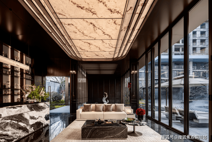 进入社区大堂穿过门廊,步入无风雨观景连廊,连廊串连起了整个小区各个楼栋,这不仅是为了遮阳挡雨,更是借用度假型奢适酒店的理念,将园林与建筑完美融合,让空间的功能性与体感达到平衡,带来沉浸式观景享受。