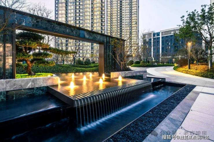 目光不自觉地被正中央的水景景墙吸引,为营造极致的品质感,项目不吝成本,将石材全部升级为普拉达绿奢石,如浪花般的纹理自然流畅,恢弘大气。罗汉松下水声汩汩,东方意韵的独特美感愈发浓郁。