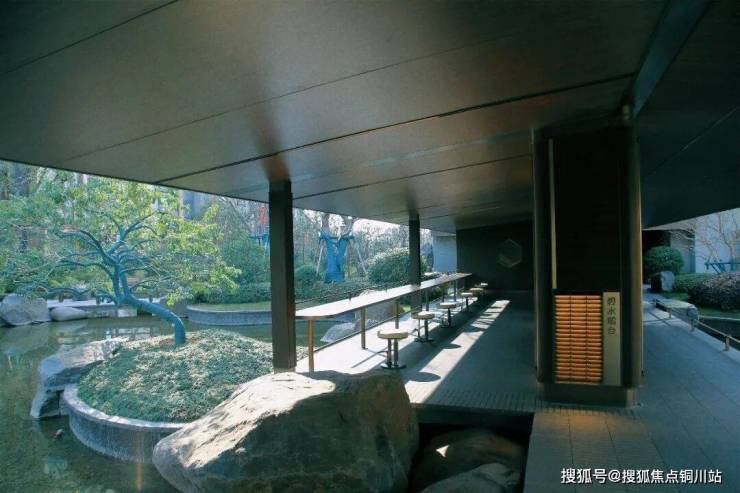约 978㎡中心水景蜿蜒成 48m 特色水廊,水波荡漾间呼应《春江花月夜》中“春江潮水连海平”的悠远意境;