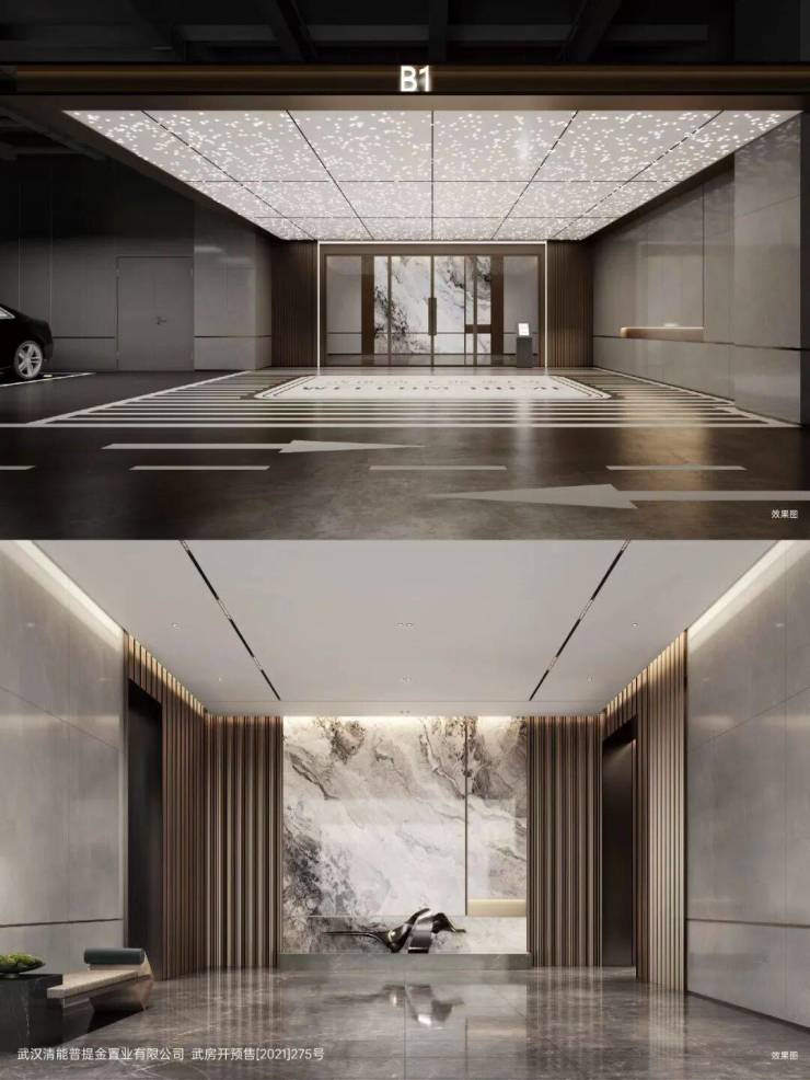 每个住宅楼栋的单元入户大堂高约6米,地下车库配置了星空顶,这种尺度对标的是市场上3w+豪宅的标准。