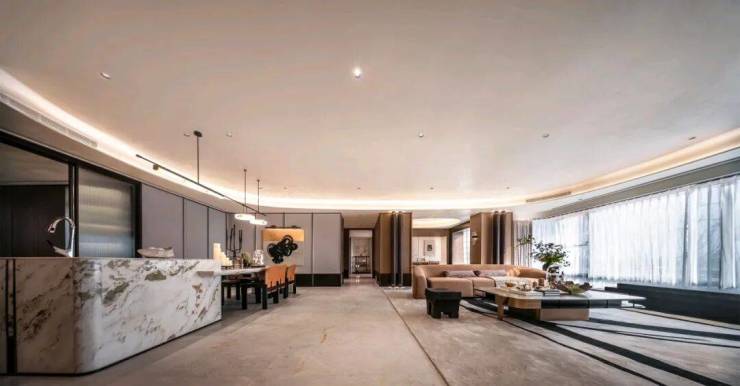 286户型面宽达到约20.3米,超尺度面宽体现了项目产品设计上对阳光、空气和景观的极致追求;建筑的四边都采用全玻璃设计,同时转角采用弧形玻璃,增加了整个户型的通透性,营造出360°的环幕超级视野;餐客厅一体化设计,形成一个完整的LDKG模块,面积达到约80㎡,空间方正,尺度舒适,私享奢华生活;多套房设计,其中主卧室面积达到约50㎡,面宽约4.6米,进深约12.1米,奢华品质尽显;分离式中西厨都是一线城市顶豪标配,中式料理和西式料理完美碰撞。