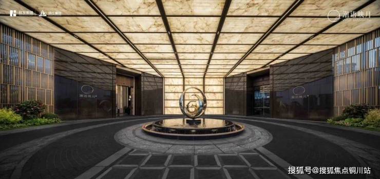 还有大门,宽约60米,挑高6米,左右两颗造型松挺拔耸立,地面采用花岗岩、PC砖铺装,墙面采用皇室啡石材搭配顶部透光云石玻璃,中间打造了“潮月相映”的雕塑水景。