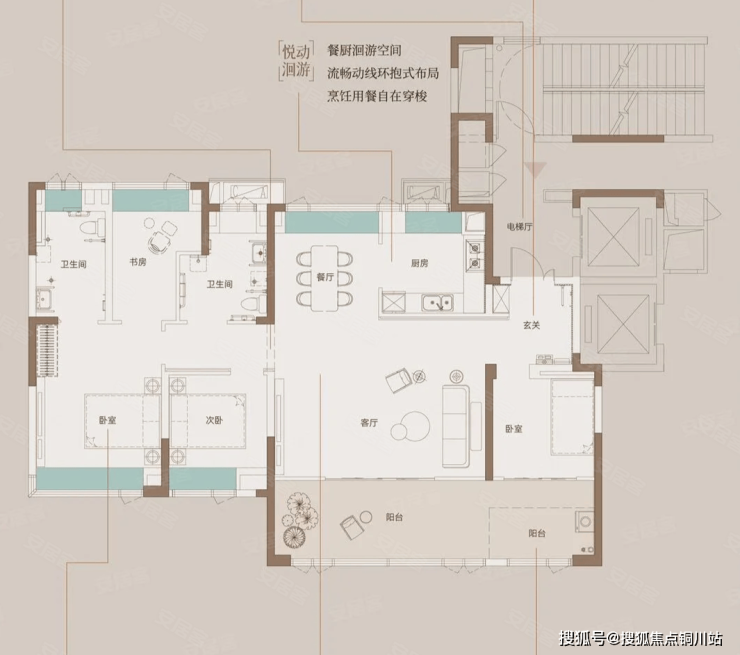 带转角阳台的155户型分布在2、3、4号楼的东边户。三开间朝南,客厅+南向次卧+东北角次卧均带270°转角阳台。该户型采光面很足公区尺度和主卧尺度都相当阔绰。