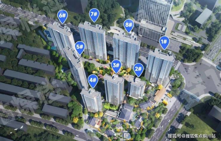 整体布局为围合式布局,8栋楼的合围部分有一个大面积的中央园林景观,东南角规划有盒子商业街。