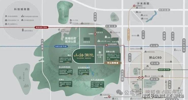 拥有着一隧道一环两轨,全维立体系的一个交通网络。 刚才我们讲到的河山隧道在我们项目南边,车程5.4公里,约10分钟左右就可以到达狮山CBD,向北的话1.8公里,约5分钟左右可以上太湖大道,向西的话可以到达科技城和绕城高速,向东的话我们直接可以连接中环西线畅达全城。市内外交通都很便捷。绿色出行公共交通的话,我们项目北面华山路有轨电车1号线,白马涧生态园站离我们项目较近,和苏州的地铁1号线,3号线都可以无缝换乘,同样畅达全程。同时还有政府正在规划的贯穿整个苏州东西两个方向的地铁9号线,未来也是从我们周边过的。