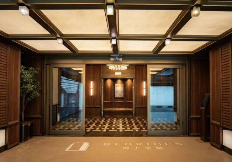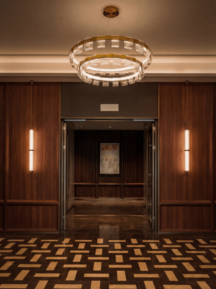 从光厅至入户,动线从容流畅,空间气度悄然转换。酒店式入户大堂将当代海派东方美学诠释得淋漓尽致, 艺术吊灯与温润木饰面巧妙相融,对称花艺与几何拼花地面彼此呼应,东方礼序与当代质感自然交融,勾勒出雅致的空间气度。
