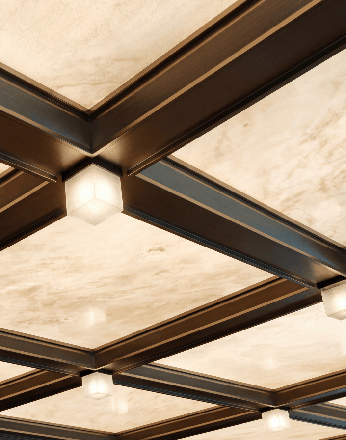 归家的尊崇感,始于驶入地库的第一瞬。 星级地下光厅以艺术光幕穹顶奠定空间基调,星辰列阵般的灯光指引前行方向, 质感金属立面与定制艺术墙画勾勒出流动的画卷,绿植错落点缀让每一次归来,都如同步入一座静谧而温暖的光之艺廊。仪式感,藏于这流转于方寸之间的深邃光影里。