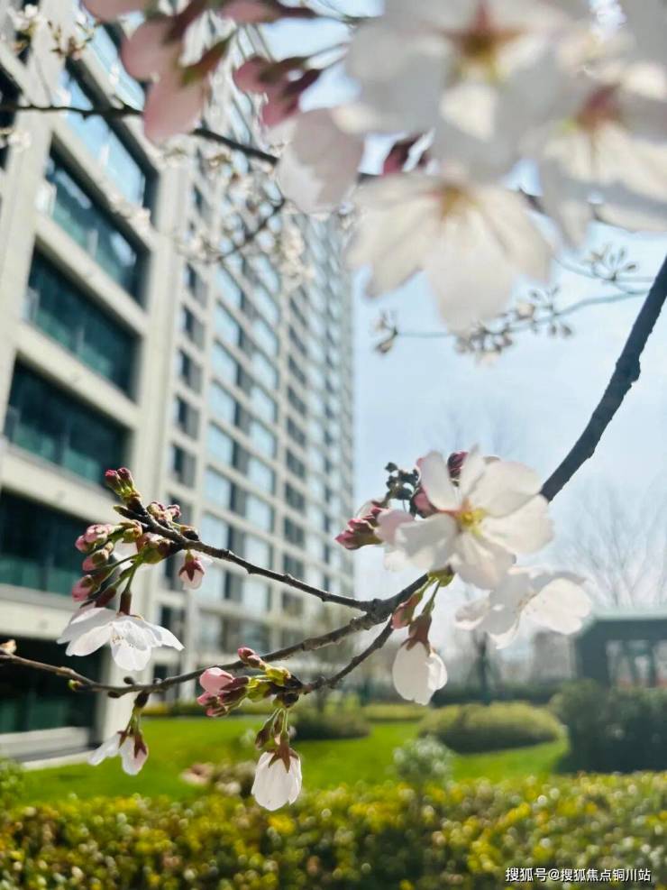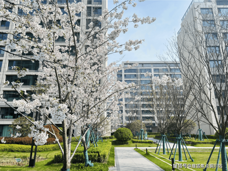 万科很注重业主的归家体验感,所以,山水间小区入口打造了仪式树阵和大面的绿化,两旁的樱花树绽放,美不胜收。
