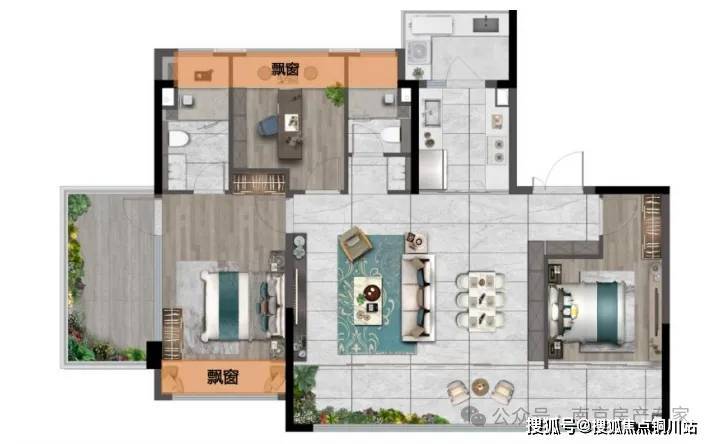同时,项目的赠送面积非常大,基本上每个房间都有飘窗或者露台,就连卫生间也有飘窗设计,全屋光飘窗赠送面积就达到7-8㎡,延伸更多空间!