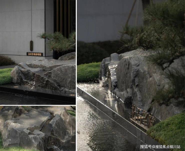 第一幅通过景墙的框景,使人们的注意力集中在中心的景观上,一松,一石,一池水便是画卷,文石水墨、无边静水,寓山于水,一静一动,动静之间又有无限深意,如《姑苏繁华图》中的一处缩影,松石相望,流水相伴;入口设置了三步台阶寓意:云接三级,步步高升,此外营造了两幅长卷画面。