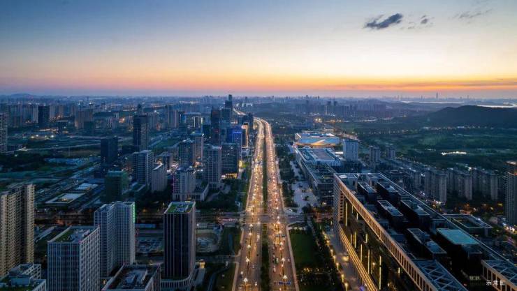 南瞰高新大道——万亿产业动脉,中建三局、国采中心、湖北省科技馆、东新管委会一字排开;