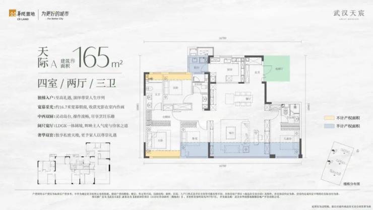 项目为准四代住宅,全部四房,洋房270度全景舱,得房率均在90%以上,最高近100%,简直是二七滨江今年的王炸!
