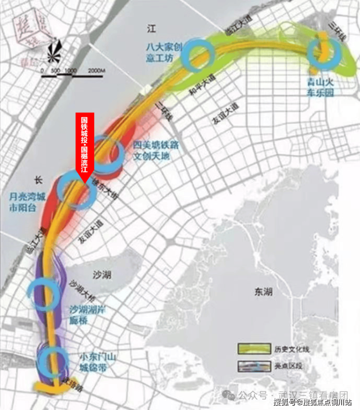 总长度13.46公里,共分为两期建设,一期工程已建成投入运营;该项目共分为三个区段,本案所在区域为武昌滨江人文体验段,包含四美塘铁路文创天地、月亮湾城市阳台等亮点。