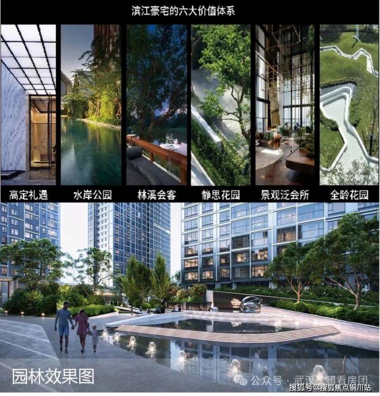 六大社区场景:高定礼遇、水岸公园、林溪会客、全龄花园、静思花园、景观泛会所