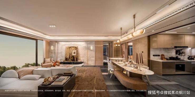 LDKB一体化设计将客厅、餐厅、厨房与阳台无缝贯通,搭配中岛台,构建出一个气场十足的家族泛会客厅,其空间感足以媲美市场上150㎡以上的户型。