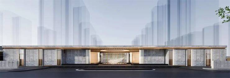 两侧立面采用爱马仕灰石材,搭配白冰玉奢石,营造出三列九阵迎宾立面。