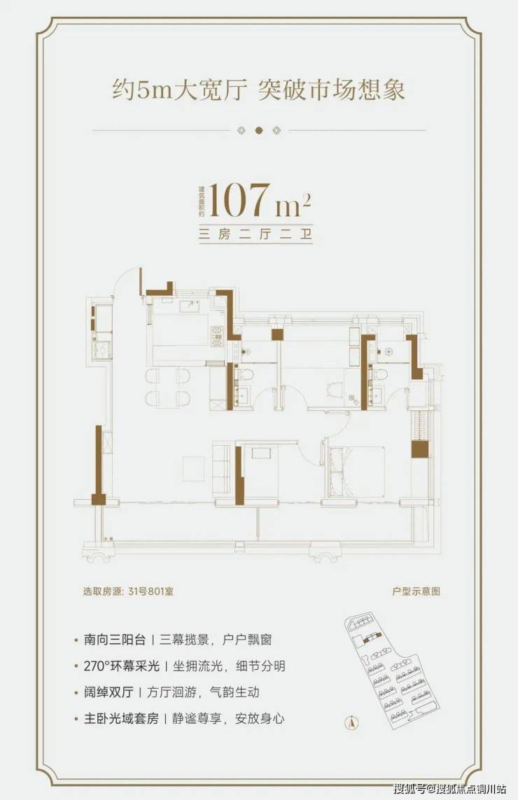 约107m²户型,赠送面积约15m²,实得率约96%,于紧凑面积中,实现罕见奢阔。完全可以满足三口之家或三代同堂年轻家庭居住!约5.0米南向大宽厅,连接约16㎡景观阳台,构成开阔的LDK一体化空间。