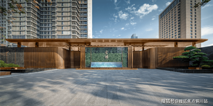 大门采用流水景墙造型,呈现出隐隐流光的玉石质地。