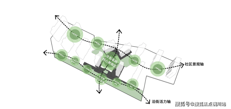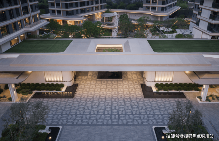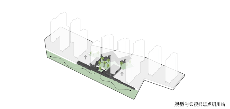 社区大门、展示区、会所位于地块西侧主要展示面,道路界面与大区标高存在错层关系,我们利用极致的场地高差,形成下沉式的绿谷景观区,打造双首层景观空间,作为社区的核心景观区,链接南北向的社区景观轴,与沿街的城市活力轴,整体形成一个充满生命力的“H”轴规划结构。核心区尽可能设置全架空,社区大堂结合下沉庭院及架空层泛会所化,提高社区品质。