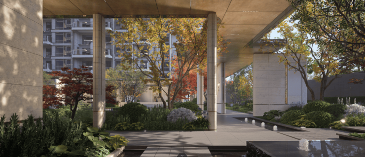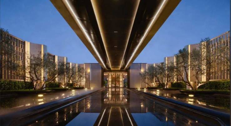 穿越第一进门庭向里走,长达24米的水景通廊,顶部的手工定制铝板,两侧8棵橄榄树在6.6米高景墙的映衬下,一同被静面水系倒映出坐看风云起的逍遥意境,也是对远离尘嚣的另一种表达。