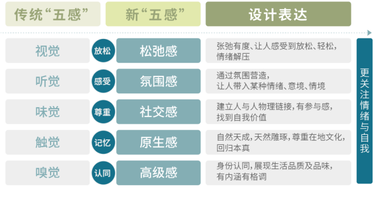 在各类社交媒体中,我们也观察到,关于氛围感、松弛感等讨论的热度居高不下,这也正是一种生活风格及趋势的演化,是新一代客户内心精神需求的投射。这股新“五感”风也渐渐刮到住宅产品中,也是我们非常看好的产品设计趋势。这种趋势更强调人的真切感受,我们也更多将这种趋势运用到了景观设计中,在我们看来,大自然的治愈性是天然的情绪载体。