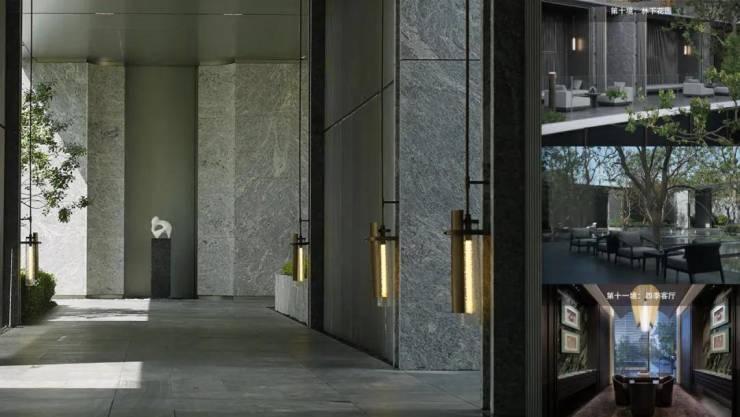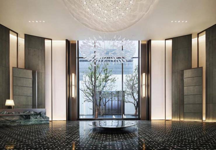 设计上采用定制奢石、不锈钢精雕屏风、艺术灯具,营造高级酒店的庭院会客场景,业主可以在此归家漫步、休息、会客,匹配天珺业主的身份感。