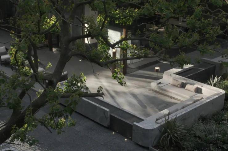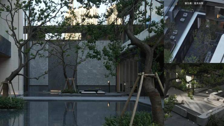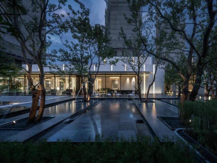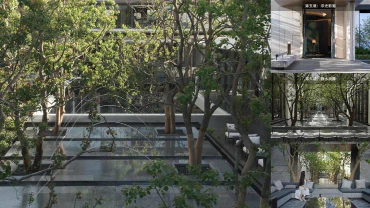 下沉式水院,外围被水和林带包裹,景观无界;打造静谧与艺术包裹的下沉休憩空间;冥想卡座,林溪环绕,塑造自然与理想交织的品质会客空间。