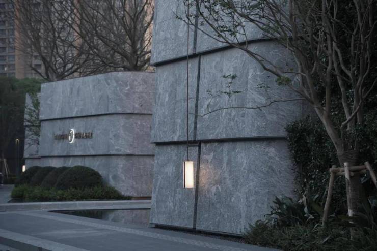 两侧特选高大繁茂的庇荫乔木树种—朴树,景墙为定制的名贵海浪灰奢石,在重复的阵列美学下,业主归家行走其中,实现从繁华到自然静谧的情绪转换。