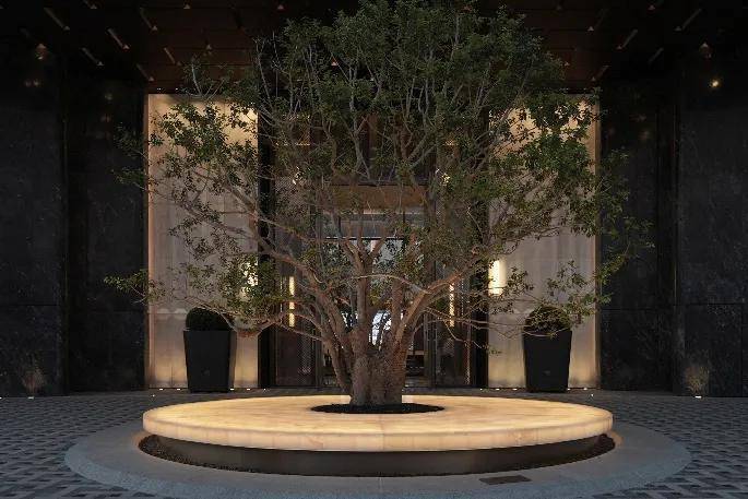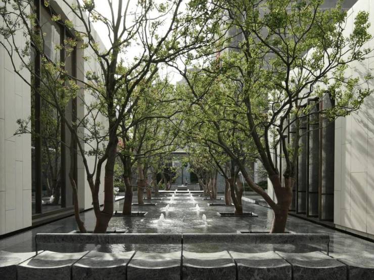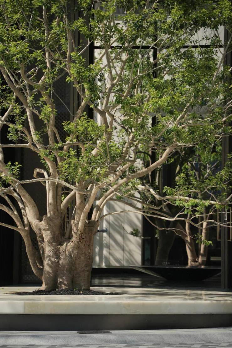 水轴内种植了16颗珍藏级乌桕树,是从100多个林场甄选而出,树龄超30年,最高可达10米,夏季青翠,秋如红枫 ,万物静观皆自得,四时佳兴与人同,清风徐来,静听溪流。