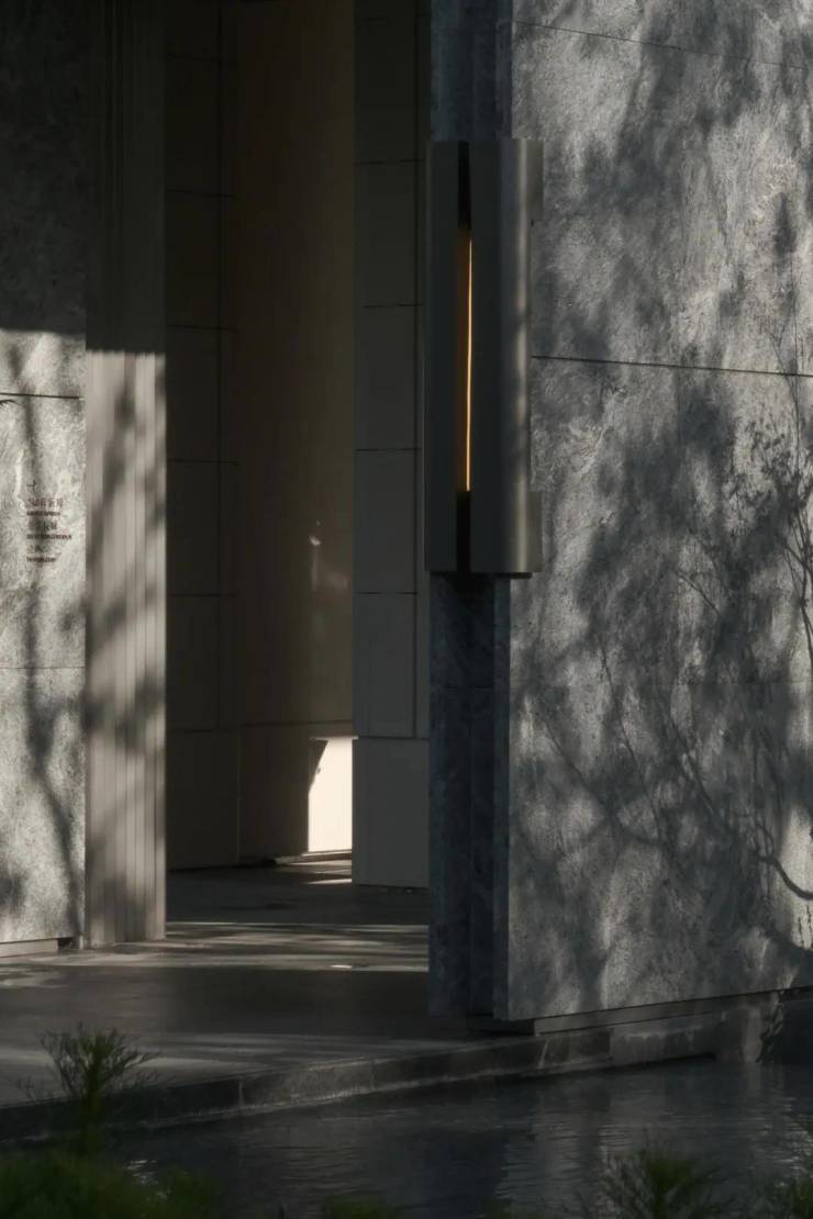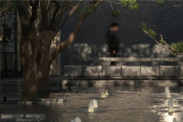 短廊是水轴的观景位,在影廊行走,或闲坐于海浪灰艺术座椅。转身对望,轴线水脉与树木交相掩映,浮光掠影,流水潺潺,热闹城央之中取得自然共融之美。