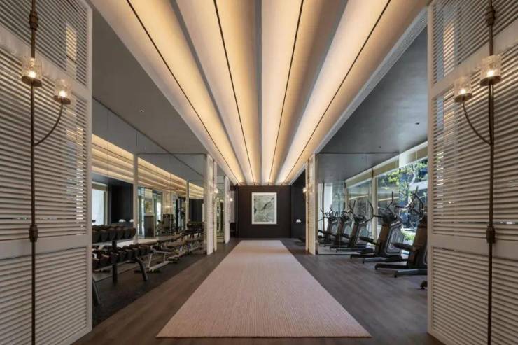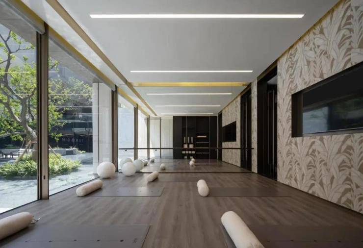 运动私享区规划专业健身、瑜伽两大功能,配备顶级健身设备,大面积全景落地玻璃窗,开阔视野,下沉庭院的美景一览无遗。